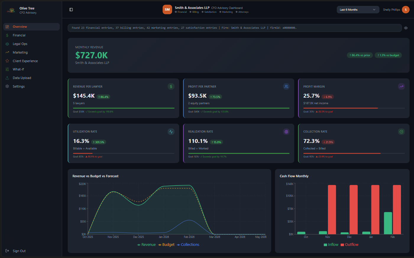 I bring these to life by combining accurate, compliant trust accounting, a custom interactive CFO dashboard that lets you explore your firm's numbers in real-time, and AI‑powered workflows—so you can focus on your client cases while your numbers speak the financial story of a profitable firm.